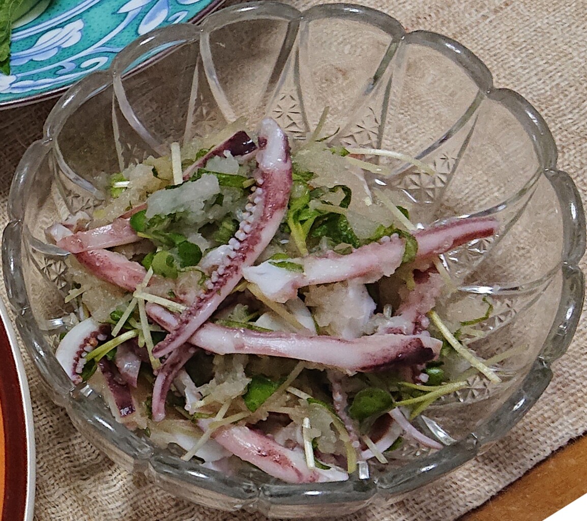 イカ下足と香味野菜のおろし和え スルメイカの刺身 ぶつぶつもぐもぐ 日々の食生活とか云々