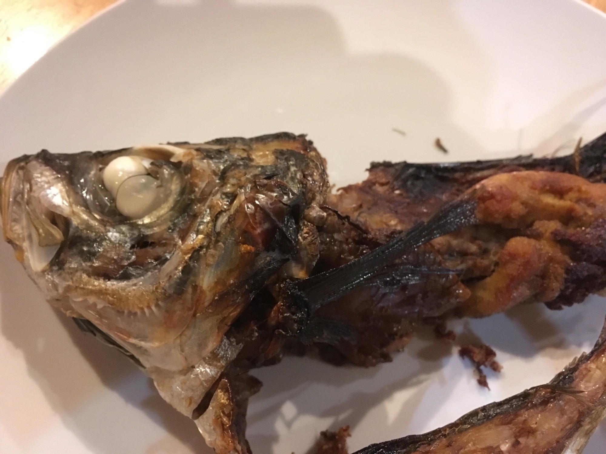 Yhmtmt 自炊 魚 昨日のアジのあらの干物 塩水に浸けて 焼酎で洗って 今朝から夕方まで干した 右下はかまの部分 これがまた茶漬けの具になる 今日はまだ食べない